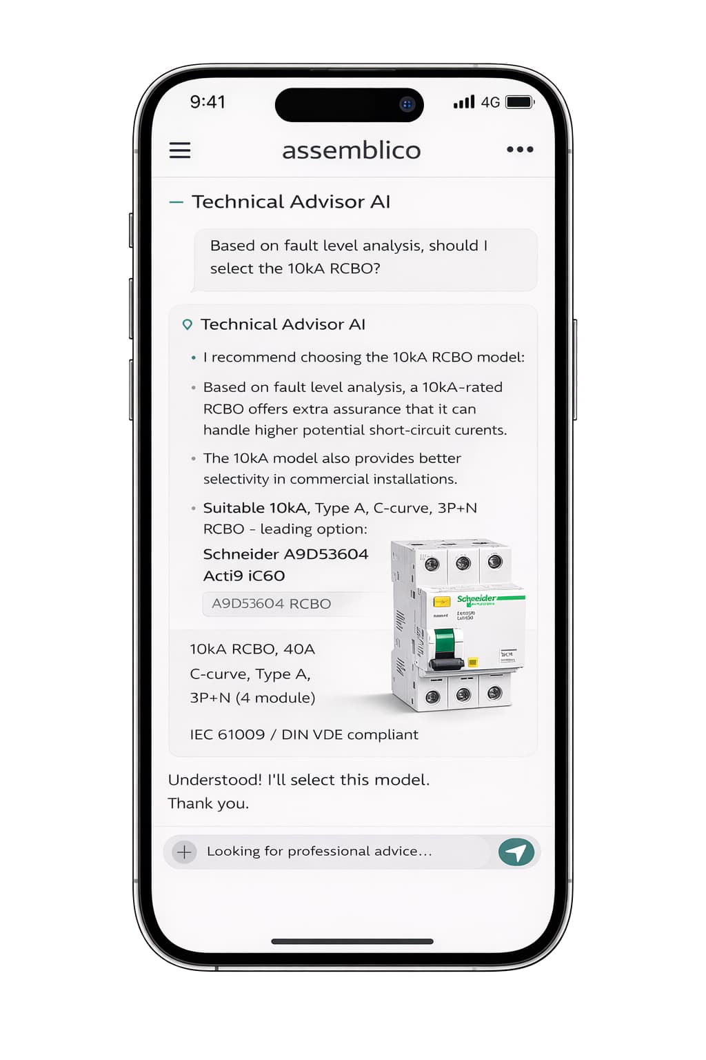 Type the fixture name into the chat. AdvisorAI immediately pulls the exact technical data, saving you from digging through dozens of PDFs on your phone.